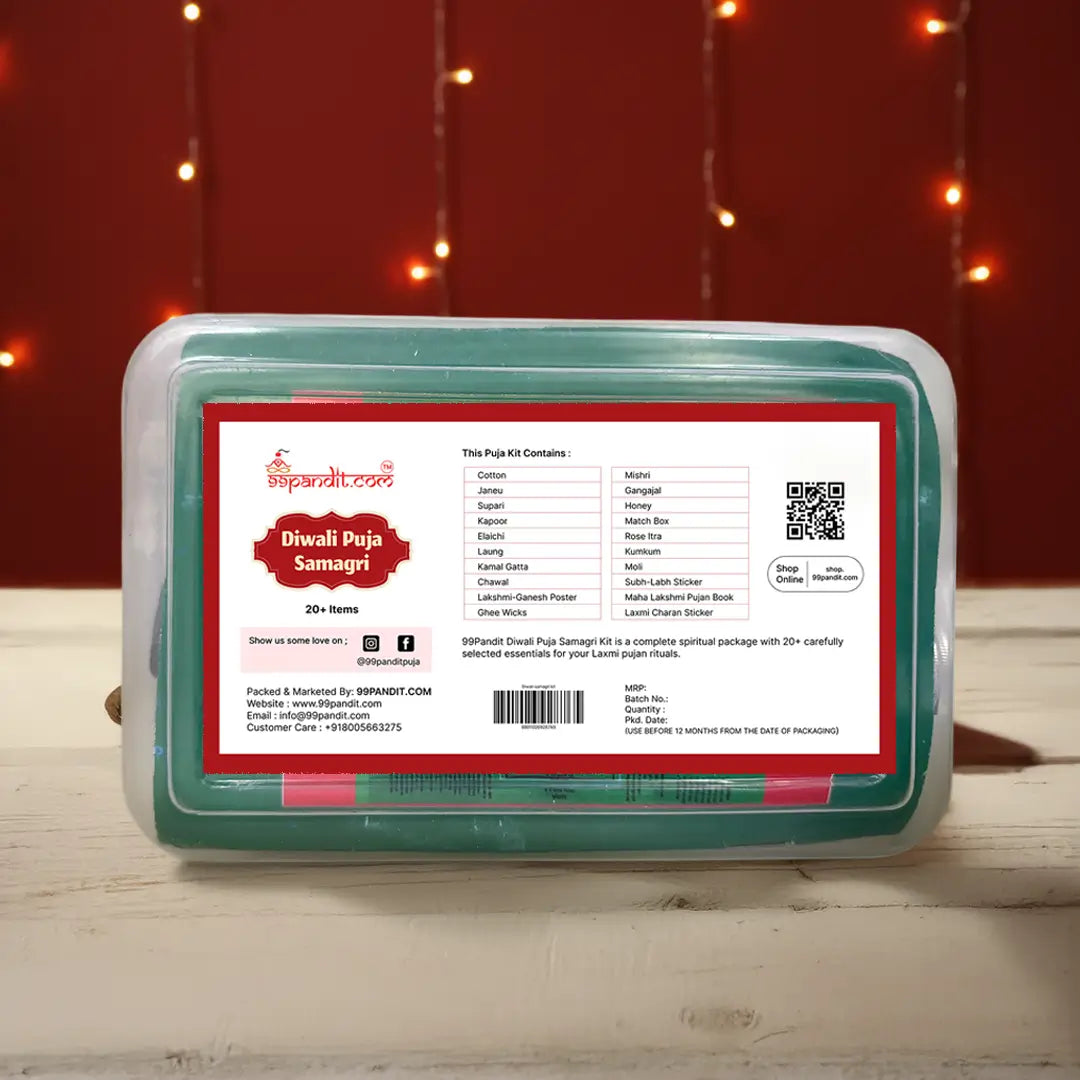 99Pandit Diwali Puja Samagri Kit contains 20+ essential items including cotton, kapoor, janeu, chawal, ghee wicks, kumkum, haldi, honey, and more. Designed for Lakshmi Ganesh Pujan, this ready-to-use kit ensures a complete and authentic Diwali puja experience in one box.